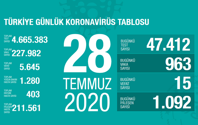 Sağlık Bakanlığının internet sitesinde yer alan ve Sağlık Bakanı Fahrettin Koca’nın paylaştığı “Türkiye Günlük Koronavirüs Tablosu”nun güncel verilerine göre, son 24 saatte 47 bin 412 test yapıldı. Bu kapsamda 963 kişiye Kovid-19 tanısı konuldu.