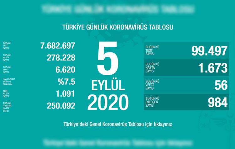 Sağlık Bakanlığının internet sitesinde yer alan ve Sağlık Bakanı Fahrettin Koca’nın paylaştığı “Türkiye Günlük Koronavirüs Tablosu’nun güncel verilerine göre, son 24 saatte 99 bin 497 test yapıldı. Verilere göre bugünkü hasta sayısı 1673 oldu.