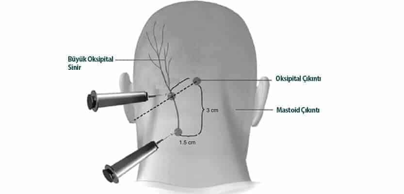 MİGREN VE DİĞER BAŞ AĞRILARINDA OKSİPİTAL BLOKAJMigren baş ağrısının ön planda olduğu yaklaşık 4-72 saat aralıklarında sürebilen hastanın bu dönem içerisinde kokudan, ışıktan rahatsız olduğu bir durumdur. Bununla beraber migren atağı sırasında görme kayıpları, duygusal çöküntüler, nadir de olsa yarı felçlerde eşlik edebilir.Migrenin beyindeki kan damarları ve nörotransmitterlerdeki değişikliklere bağlı olduğu düşünülmektedir ancak bu değişikliklerin niçin oluştuğu konusunda araştırmalar halen sürmektedir. Kısaca vücuttaki otonom sinir sisteminin geçici aksamasıyla ilişkilidir. Kabaca bir tarif eğer başağrısı veya diğer belirtiler sizi normal günlük yaşamınızdan alıkoyuyorsa bu migren olabilir. Migren kendine yukarda anlatılan kendine has özellikleriyle diğer baş ağrılarından kolayca ayrılabilir.Bayanlarda sık görülmekle birlikte 20-40 yaş aralığında daha sıktır. Çevresel, psikolojik etkenlerle birlikte bazı gıdaların alımıyla da tetiklenebilir.Oksipital blokaj başın ağrı duyusuyla ilgili sinirin anestezik maddelerle ağrı duyusunu algılamasını bloke etme yöntemidir.Oksipital sinir bloku, hasta oturur pozisyonda ve baş hafif öne eğik posizyonda iken uygulanır. Başın arka kısmında orta hattı her iki yanında oksipital arterin hemen yanında olan oksipital sinire 2,5 cm 24-26 G iğne ile, hafif kranyal açı verilerek girilir ve kafatası kemiği ile deri arasına 3-5 ml lokal anestezik enjekte edilir.Genellikle sistemik etkileri olmayan güvenli lokal bir tedavidir. Etkinliğinin görülmesi için gereken süre beş dakika kadar kısadır. Yapılan çalışmalarda sadece ilaca cevap vermeyen migren ağrılarında değil, aşırı ilaç kullanımına bağlı baş ağrısı olan hastalarda, servikojenik baş ağrısı, küme baş ağrısı ve oksipital nevraljide oksipital sinir bloğu ile değişen oranlarda olumlu yanıt alındığı gösterilmiştir. Asıl olarak bu tedavinin klinik kullanmıda faydası ilaçlara cevap vermeyen ve şiddetli migren atakları olan hastalarla, ağrılar nedeniyle sürekli ağrı kesici kullanımı zorunda olan hasta grublarına yöneliktir.Lokal bir tedavi olduğu için belirgin riski yoktur. Nadir olgularda boyun ağrısı ve baş dönmesi yapabilir fakat bizim kliniğimizde böyle bir yan etkiye rastlamadık.Verilen lokal anesteziklerin migrende etkili olan sinirlerden miyelinsiz C lifleri ve ağrıya aracılık eden ince miyelinli Ad liflerinin ağrı iletimini belirli bir süre durdurmalarıyla etkili. Yapılan belirli seanslardan sonra mekanizması tam olarak anlaşılamamakla birlikte migren atakları enjeksiyonun etki süresi bitmesine rağmen tekrar gelmemektedir. Asıl tedaviyi önemli kılan özelliği de budur.