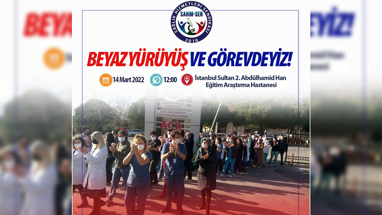 Sağlık Hizmetleri Sendikası (SAHİM-SEN) 14 Mart Tıp Bayramı’nda, İstanbul Sultan 2. Abdulhamid Han Hastanesi önünde saat 12.00’da “Beyaz Yürüyüş” ile sağlık sistemindeki sorunları protesto ediyor. Alkışlı protesto gösterisinde bulunacak olan sağlık emekçileri, 36 maddelik talep manifestolarını açıklayacak.