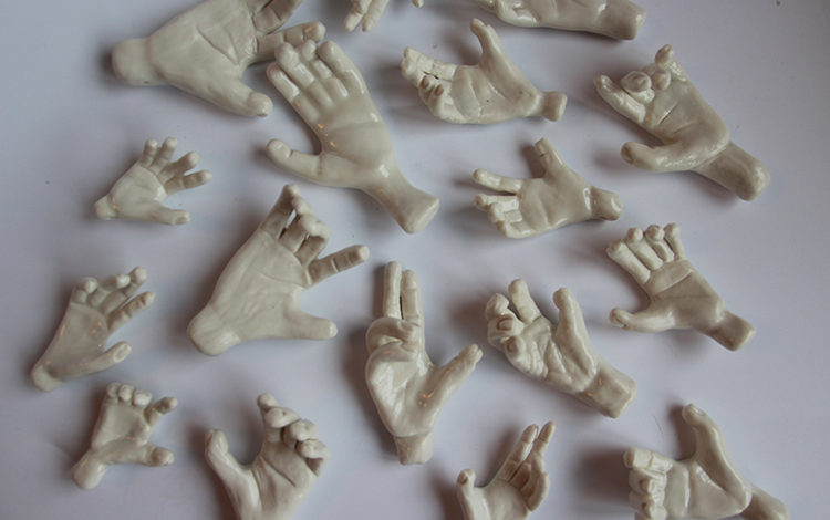 “Genel olarak ben sağlıkçıların tükenmişliğini nasıl gördüğümü porselen çamuru ile ifade ettim. Porselen pişmeden önce yumuşak, kuruduğunda kırılgan ama kolay yapışan ve fırına girip piştiğinde ise 1250 derece gibi çok yüksek ısıya dayanan bir malzeme. Tıpkı sağlıkçılar gibi. Bana ilk ilham veren Covid nöbetinden çıkan bir sağlıkçının eldivenini çıkardığında buruş buruş ellerinin fotoğrafıydı. Ben bu eli yaptım ilk. Sonra birbirlerinin üstüne yığılmış ve adeta nöbet çıkışı kirliye atılan formalar gibi birbirinin üstüne yığılmış kağıt gibi sağlıkçılar yaptım. Maskeler ve siperliklerin yüzde yaptığı yaraları olan masklar yaptım. Tüm bunlar hep tükenmişliklerin görülmesi ve hatırlanması içindi. Ancak sağlıkçıların ellerinin herşeye rağmen şifa vermeye açık olduğunu hatırlatmak için bir çok beyaz porselen minik el yaptım. Bunlar ayrıca bizim de hem sağlıkçılara hem de tüm topluma uzatmak istediğimiz ellerimiz. Yani dayanışmanın elleri.”