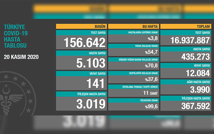 Toplam test sayısı 16 milyon 937 bin 887, toplam hasta sayısı 435 bin 273, toplam vefat sayısı 12 bin 084, hastalarda zatürre oranı yüzde 3,8, toplam ağır hasta sayısı 3 bin 990, toplam iyileşen hasta sayısı 367 bin 592 oldu.