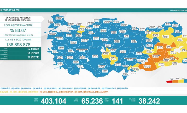 Buna göre, son 24 saatte 403 bin 104 Kovid-19 testi yapıldı, 65 bin 236 kişinin testi pozitif çıktı, 141 kişi yaşamını yitirdi, iyileşenlerin sayısı 38 bin 242 oldu.