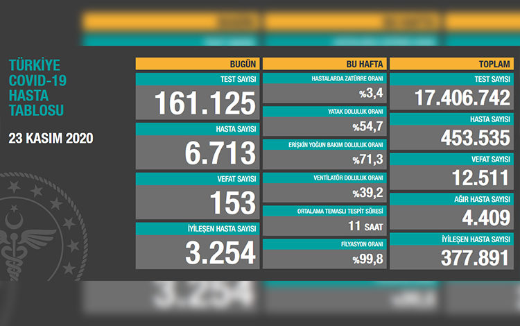 Sağlık Bakanlığının internet sitesinde yer alan ve Sağlık Bakanı Fahrettin Koca’nın paylaştığı “Türkiye Günlük Koronavirüs Tablosu’nun güncel verilerine göre, son 24 saatte 161 bin 125 test yapıldı. Verilere göre bugünkü hasta sayısı 6 bin 713 oldu.