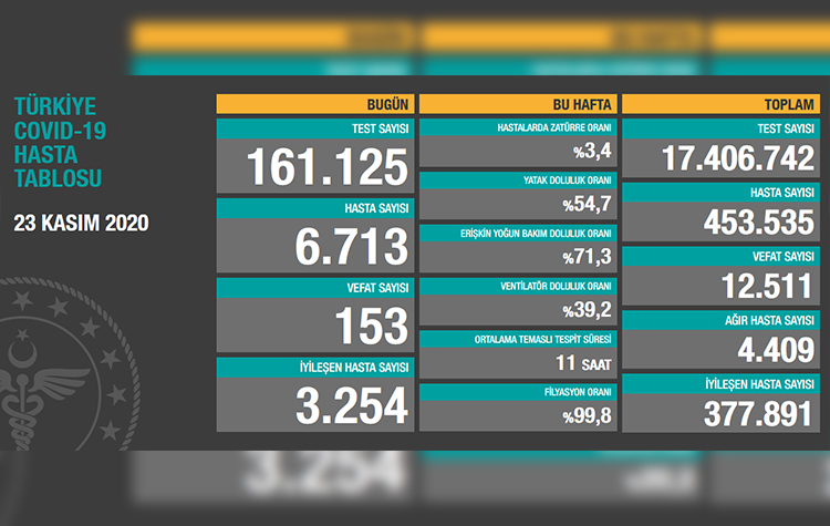 Sağlık Bakanlığının internet sitesinde yer alan ve Sağlık Bakanı Fahrettin Koca’nın paylaştığı “Türkiye Günlük Koronavirüs Tablosu’nun güncel verilerine göre, son 24 saatte 161 bin 125 test yapıldı. Verilere göre bugünkü hasta sayısı 6 bin 713 oldu.