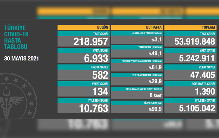 Test sayısı 53 milyon 919 bin 848’e ulaştı. Vaka sayısı 5 milyon 242 bin 911, vefat sayısı 47 bin 405, ağır hasta sayısı bin 390 oldu.