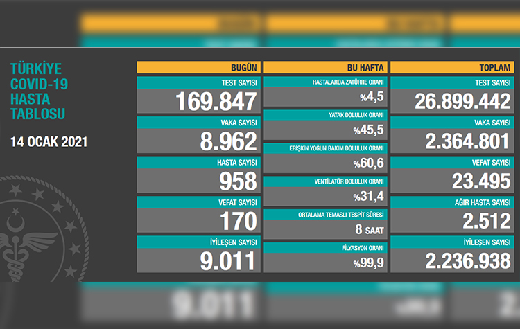 Toplam test sayısı 26 milyon 899 bin 942, toplam vaka sayısı 2 milyon 364 bin 801, toplam vefat sayısı 23 bin 495, hastalarda zatürre oranı % 4,5, toplam ağır hasta sayısı 2 bin 512, toplam iyileşen hasta sayısı 2 milyon 236 bin 938 oldu.