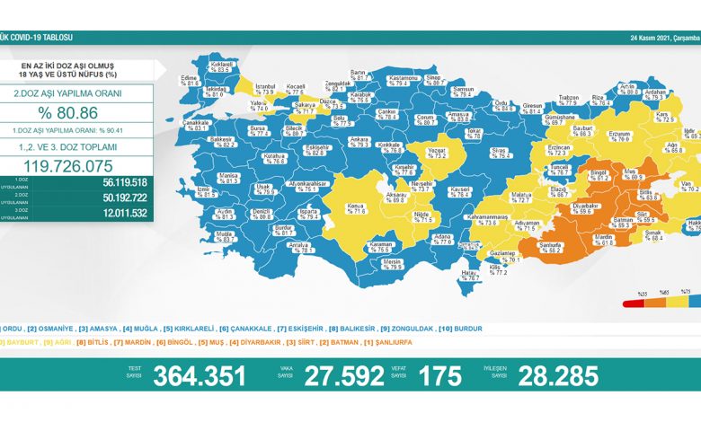 Sağlık Bakanlığının Günlük Kovid-19 Tablosundaki verilere göre; Türkiye’de son 24 saatte 364 bin 351 Kovid-19 testi yapıldı. 27 bin 592 kişi koronavirüse yakalanırken, 175 kişi hayatını kaybetti. İyileşen hasta sayısı ise 28 bin 285 oldu.
