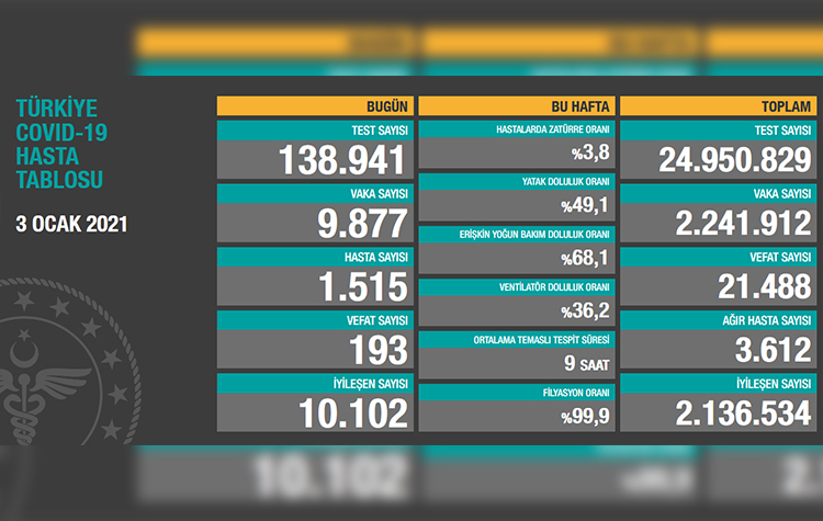 Toplam test sayısı 24 milyon 950 bin 829, toplam vaka sayısı 2 milyon 241 bin 912, toplam vefat sayısı 21 bin 488, hastalarda zatürre oranı % 3.8, toplam ağır hasta sayısı 3 bin 612, toplam iyileşen hasta sayısı 2 milyon 136 bin 534 oldu.