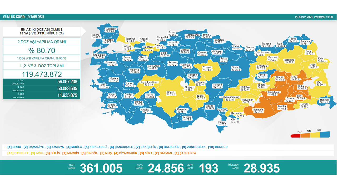 Nüfusa göre en çok aşı yapılan iller sırasıyla; Ordu, Osmaniye, Amasya, Muğla, Kırklareli, Çanakkale, Eskişehir, Balıkesir, Zonguldak ve Burdur oldu.