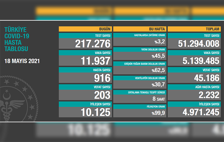 Test sayısı 51 milyon 294 bin 8’e ulaştı. Vaka sayısı 5 milyon 139 bin 485, vefat sayısı 45 bin 186, ağır hasta sayısı 2 bin 232 oldu.