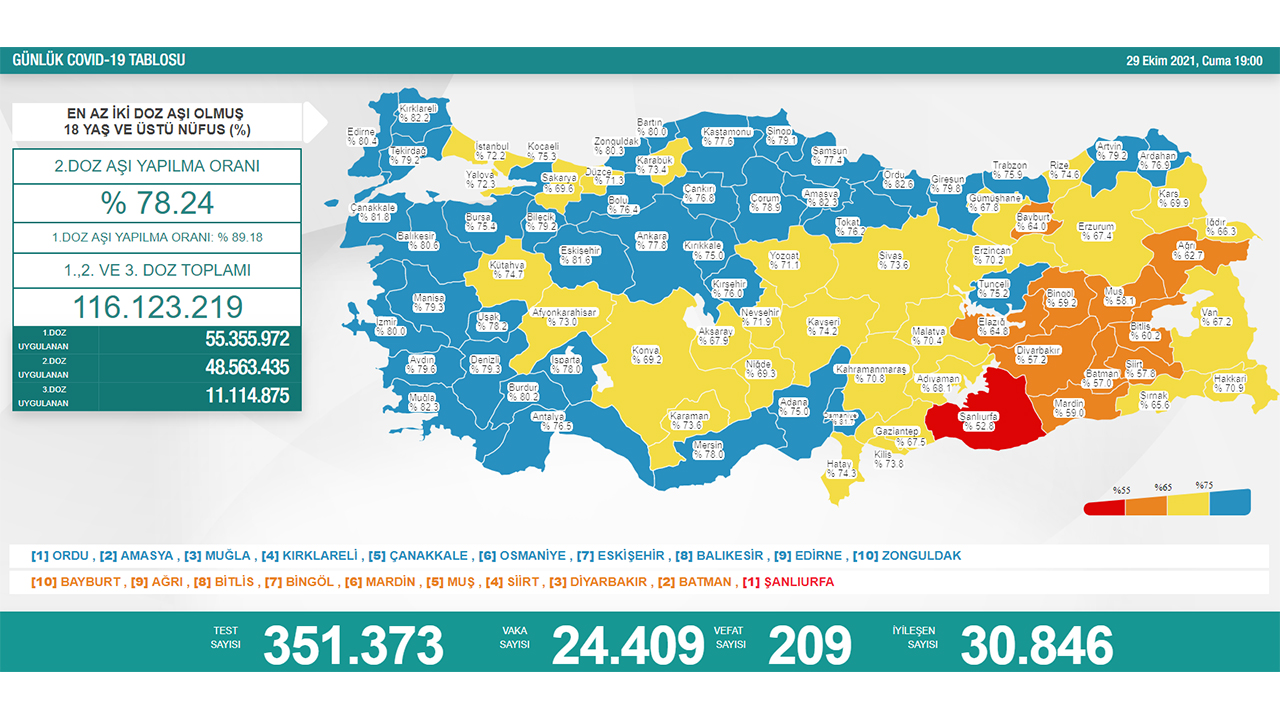 Nüfusa göre en çok aşı yapılan iller sırasıyla; Ordu, Amasya, Muğla, Kırklareli, Çanakkale, Osmaniye, Eskişehir, Balıkesir, Edirne ve Zonguldak oldu.
