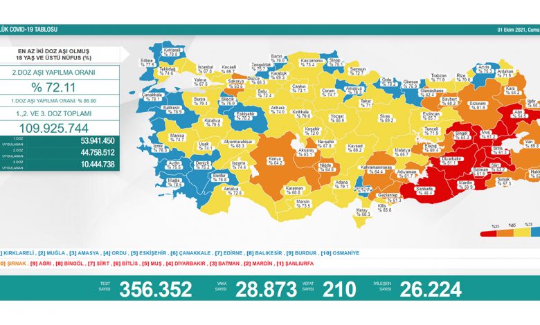 Sağlık Bakanlığının Günlük Kovid-19 Tablosundaki verilere göre; Türkiye’de son 24 saatte 356 bin 352 Kovid-19 testi yapıldı. 28 bin 873 kişi koronavirüse yakalanırken, 210 kişi hayatını kaybetti. İyileşen hasta sayısı ise 26 bin 224 oldu.