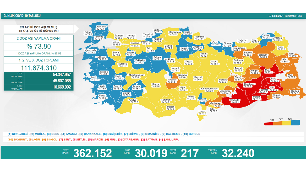 Nüfusa göre en çok aşı yapılan iller sırasıyla; Kırklareli, Muğla, Ordu, Amasya, Çanakkale, Eskişehir, Edirne, Osmaniye, Balıkesir ve Burdur oldu.