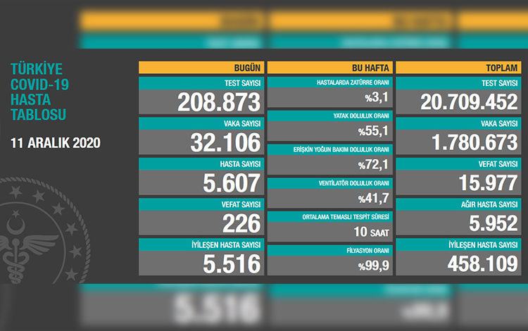 Sağlık Bakanlığının internet sitesinde yer alan ve Sağlık Bakanı Fahrettin Koca’nın paylaştığı “Türkiye Günlük Koronavirüs Tablosu’nun güncel verilerine göre, son 24 saatte 208 bin 873 test yapıldı. Verilere göre bugünkü hasta sayısı 5 bin 607 oldu. Toplam vaka sayısı ise 32 bin 106 olarak açıklandı.