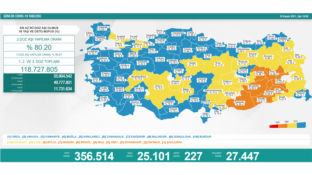 Nüfusa göre en çok aşı yapılan iller sırasıyla; Ordu, Amasya, Osmaniye, Muğla, Kırklareli, Çanakkale, Eskişehir, Balıkesir, Zonguldak ve Burdur oldu.