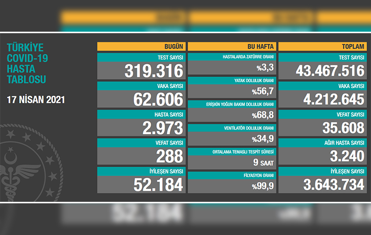 Test sayısı 43 milyon 467 bin 516’ya ulaştı. Vaka sayısı 4 milyon 212 bin 645, vefat sayısı 35 bin 608, ağır hasta sayısı 3 bin 240 oldu.
