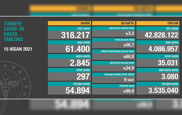 Türkiye Günlük Koronavirüs Tablosu paylaşıldı. Ülkemizde son 24 saatte 318 bin 217 koronavirüs (Covid-19) testi yapıldı, 61 bin 400 kişinin testi pozitif çıktı, 297 kişi hayatını kaybetti.