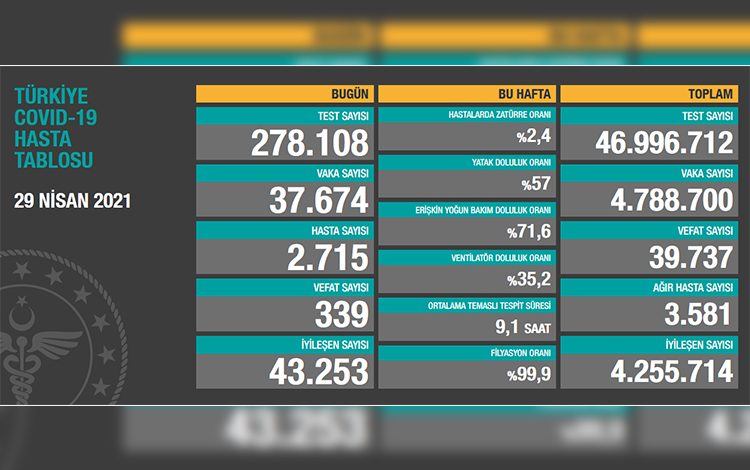 Test sayısı 46 milyon 996 bin 712’şe ulaştı. Vaka sayısı 4 milyon 788 bin 700, vefat sayısı 39 bin 737, ağır hasta sayısı 3 bin 581 oldu.