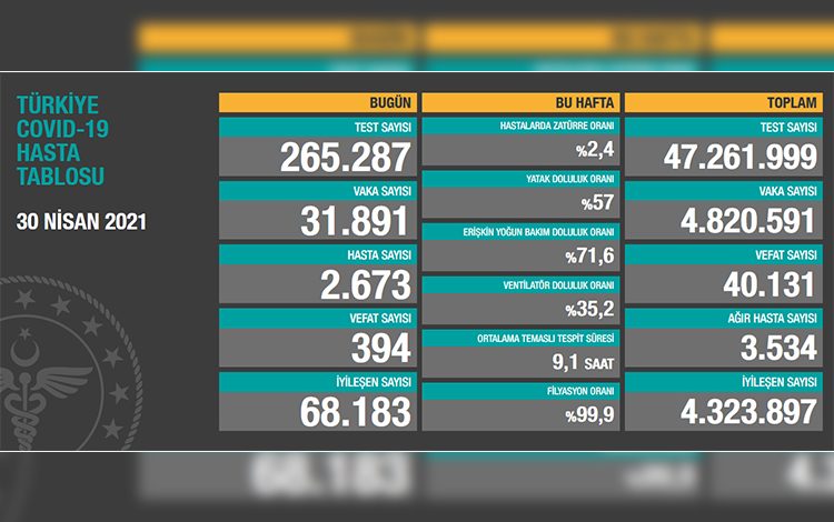 Türkiye Günlük Koronavirüs Tablosu paylaşıldı. Ülkemizde son 24 saatte 265 bin 287 koronavirüs (Covid-19) testi yapıldı, 31 bin 891 kişinin testi pozitif çıktı, 394 kişi hayatını kaybetti.