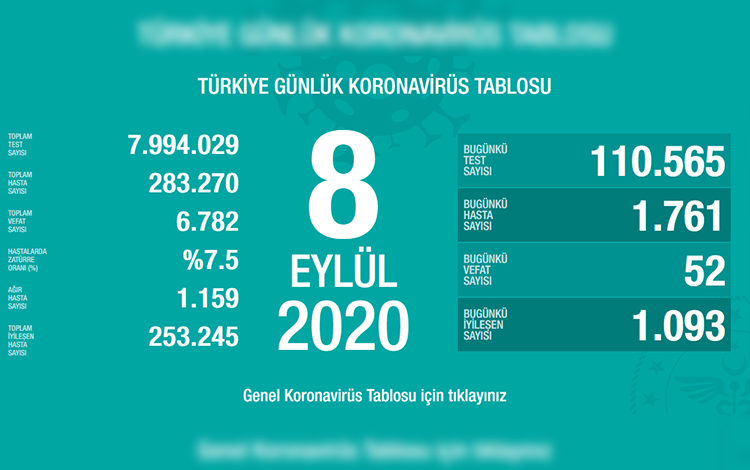 Toplam test sayısı 7 milyon 994 bin 029, toplam hasta sayısı 283 bin 270, toplam vefat sayısı 6 bin 782, hastalarda zatürre oranı % 7,5, toplam ağır hasta sayısı 1159, toplam iyileşen hasta sayısı 253 bin 245 oldu.