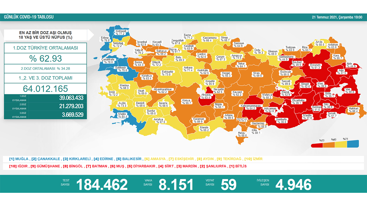En az aşı yapılan iller ise Bitlis, Şanlıurfa, Mardin, Siirt, Diyarbakır, Muş, Batman, Bingöl, Gümüşhane ve Iğdır şeklinde kayıtlara geçti.