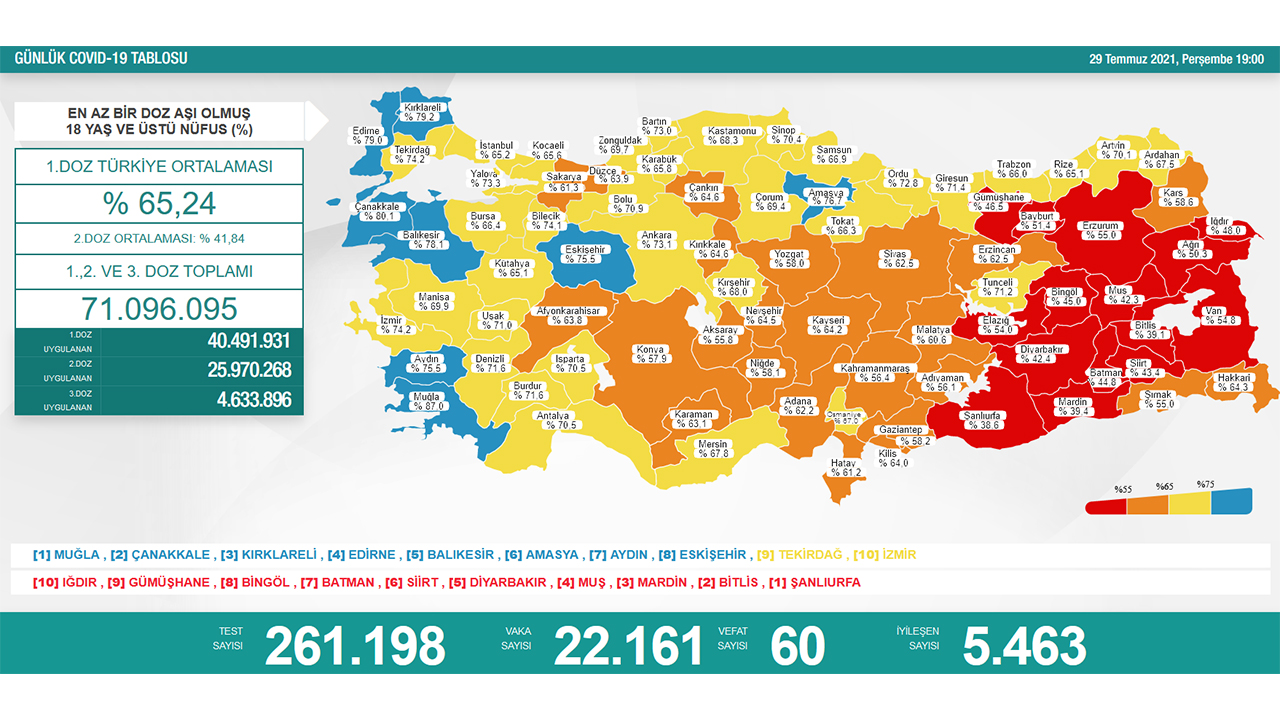 En az aşı yapılan iller ise Şanlıurfa, Bitlis, Mardin, Muş, Diyarbakır, Siirt, Batman, Bingöl, Gümüşhane ve Iğdır şeklinde kayıtlara geçti.