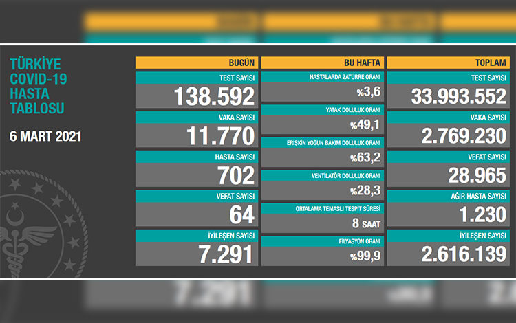 Test sayısı 33 milyon 993 bin 552’ye ulaştı. Vaka sayısı 2 milyon 769 bin 230, vefat sayısı 28 bin 965, ağır hasta sayısı 1.230 oldu.